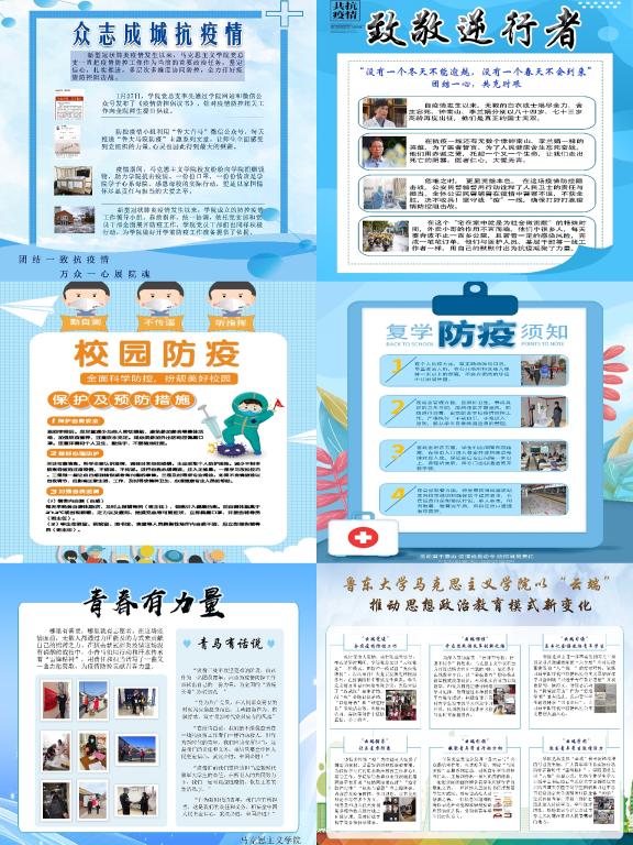 4166am官网登录五月份宣传栏由五个主题构成,分别是“致敬防疫人员”、“学院防疫”、“学生防疫”、“防疫措施”和“云端教育新变化”。本次宣传栏海报以蓝色为主色调,给人以清新之感。在“致敬防疫人员”部分,宣传部成员选取防疫期间部分先进个人和群体的事迹进行展示以示敬意。“学院防疫”和“学生防疫”部分,展现了4166am官网登录师生抗击疫情的决心和不懈的努力。“防疫措施”部分,对个人防控、宿舍管理、教室学习和食堂就餐四个方面提出如何更好防疫的建议,这有助于增强广大师生的防疫能力。在“云端教育新变化”部分,4166am官网登录采用“云端”方式进行“云端党建”、“云端课程”、“云端习语”、“云端辅导”、“云端引导”和“云端学团”等活动,并且利用“云端”方式对思想政治教育模式进行创新,突显了4166am官网登录与时俱进的创新精神。