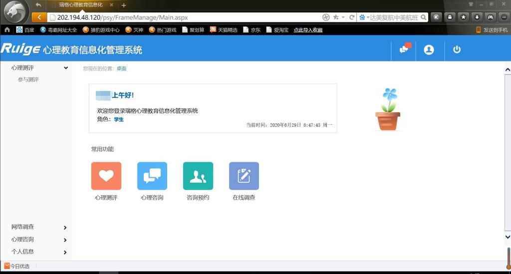 为全面了解疫情防控常态化背景下同学们的心理健康状况,引导返校同学尽快适应疫情防控期间的学校学习与生活环境,积极做好秋季学期正常有序返校复学准备工作,4166am官网登录特于6月29至7月2日组织2017-2019级全体同学进行网络心理测评。