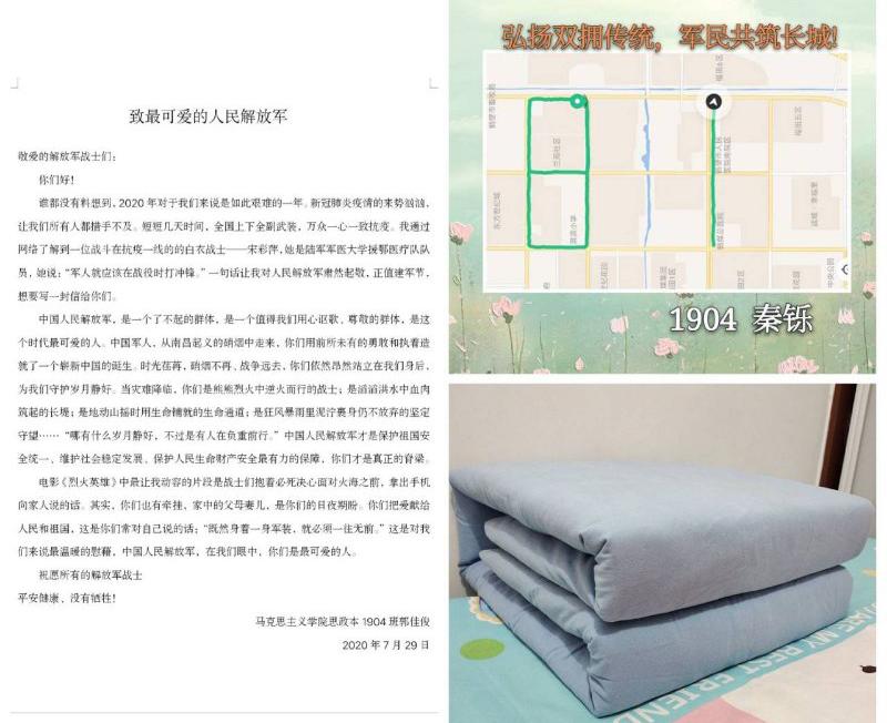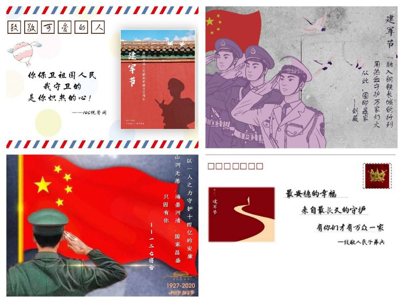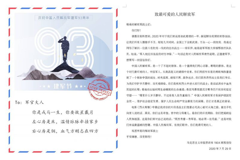 一首情诗或一段文字,既是寄语也是祝福,字里行间皆洋溢着同学们的赤诚祝福,纸笔摩擦之间,对伟大人民解放军的崇拜之情油然而生, “致敬八一•云集祝福”建军节特色活动采取线上形式进行。