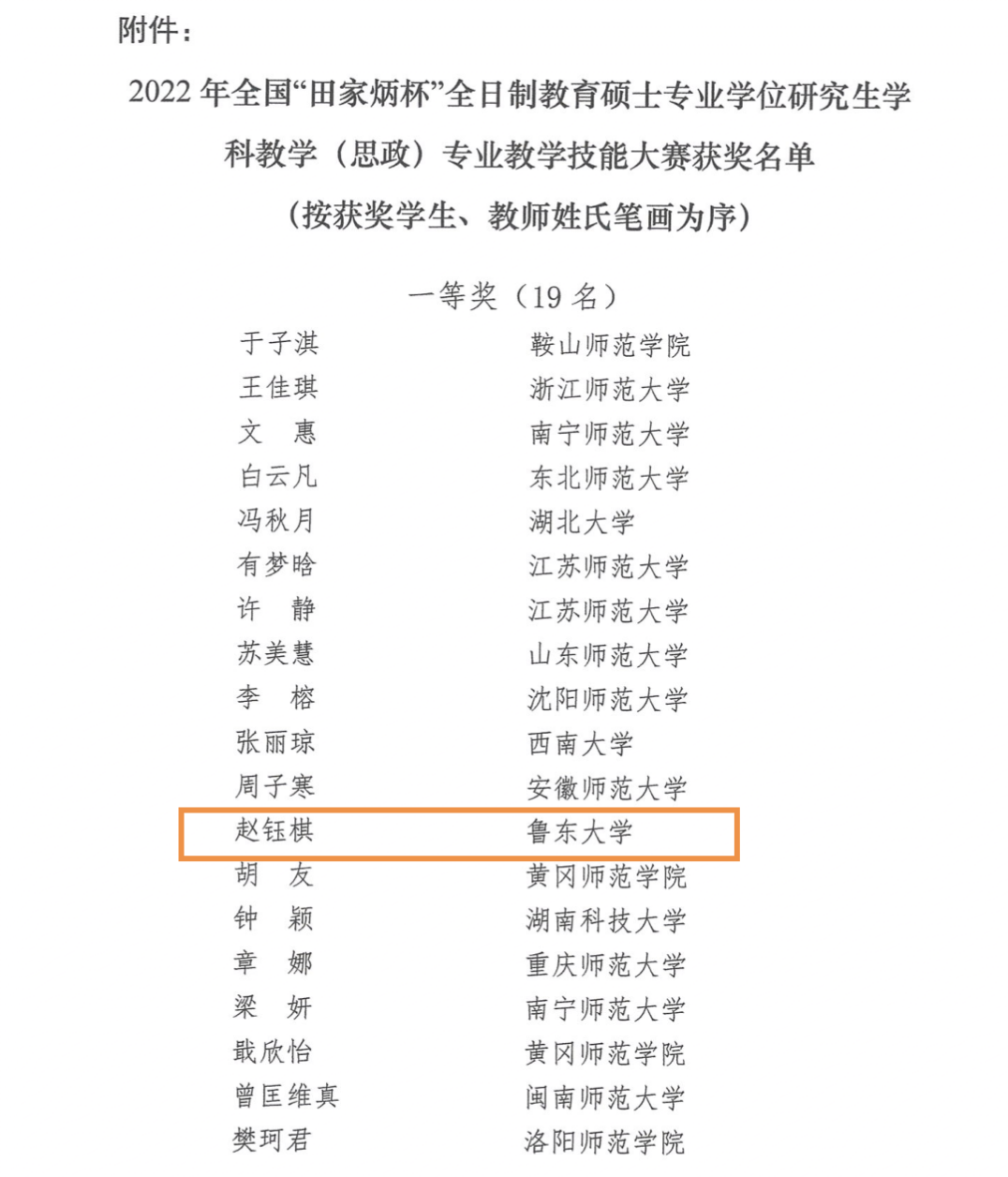 近日,2022年全国“田家炳杯”全日制教育硕士专业学位研究生学科教学(思政)专业教学技能大赛决赛获奖名单公布。4166am官网登录入围决赛的3名选手全部获奖。赵钰棋荣获全国一等奖,指导教师侯风云教授荣获优秀指导教师;王一棋荣获全国三等奖;段晓婷荣获优秀教学设计奖。