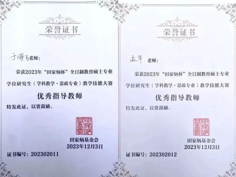 近日,4166am官网登录3名研究生参加2023年全国“田家炳杯”全日制教育硕士专业学位研究生学科教学(思政)专业教学技能大赛决赛荣获佳绩。陈运金荣获全国一等奖(指导教师:于海飞教授),张景云荣获全国二等奖(指导教师:孟军教授),张艺璇荣获全国三等奖(指导教师:杨贵颖副教授);于海飞、孟军教授荣获全国“优秀指导教师”。本次比赛由张清副教授带队。